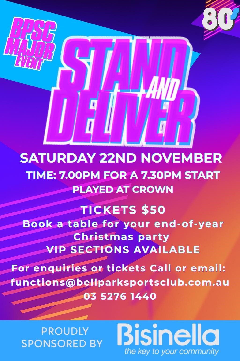 Bar specials, tapas style dining and entertainment by Australia’s number 1 80’s tribute band, Stand and Deliver.